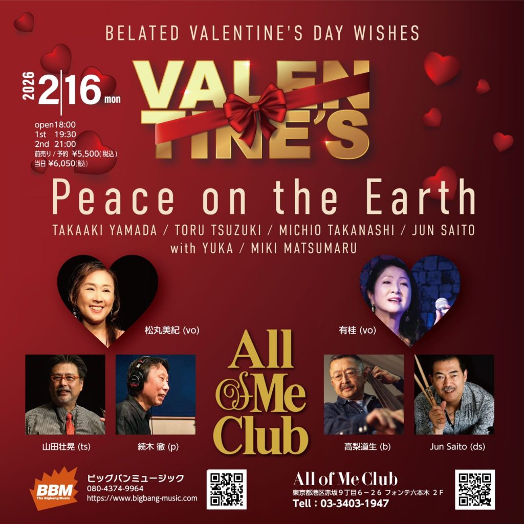 | TITLE | 2026.2.16 [BELATED VALENTINE’S DAY WISHES]「Peace on the Earth」山田壮晃カルテット with 有桂 at All of Me Club |